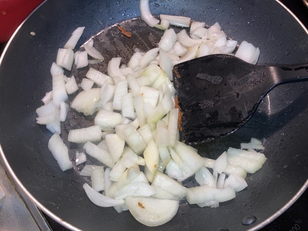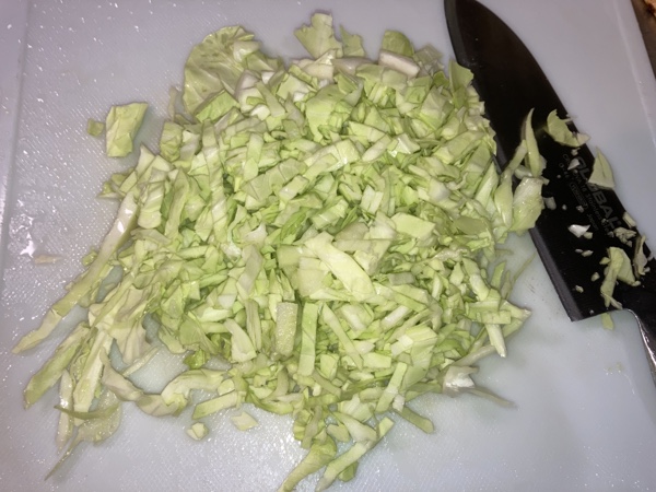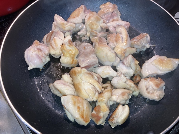 👆鶏肉モモを一口サイズにきり、フライパンでキツネ色に。キャベツ1/4をみじん切りに👇