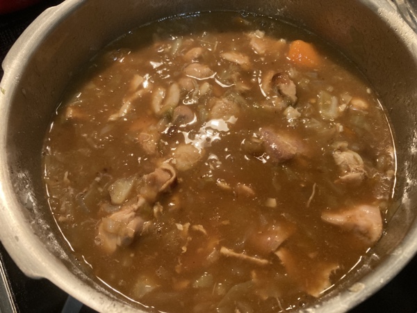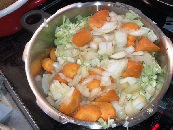 鶏肉🐓キャベツ🥬玉ねぎ🧅人参🥕を圧力鍋に投入して、お水200ccほどいれて、加圧します👇
