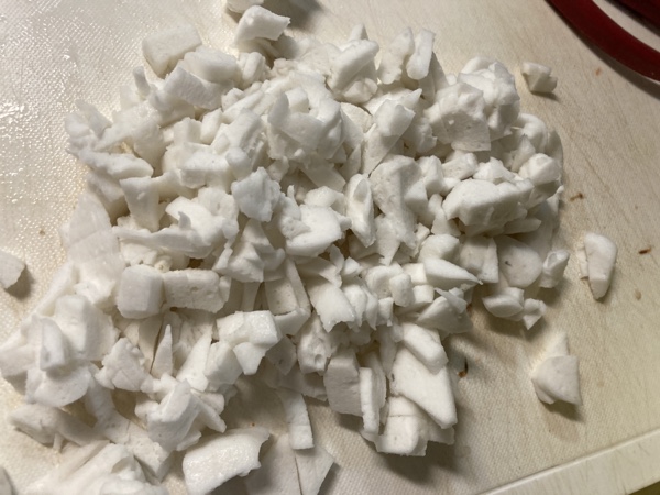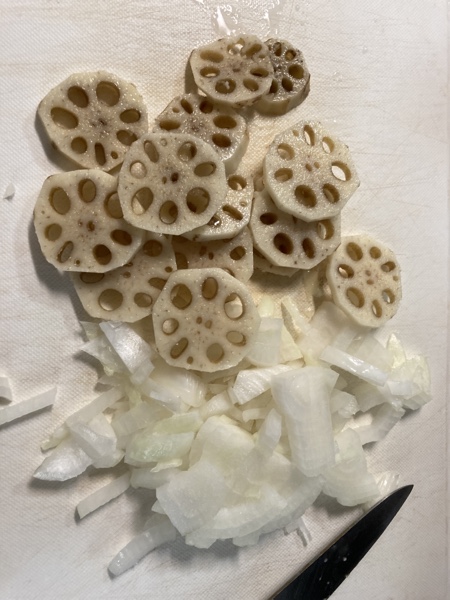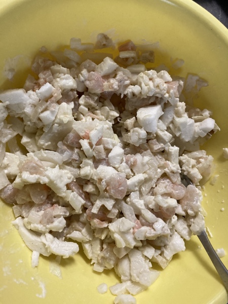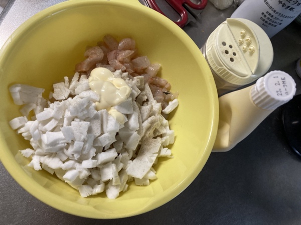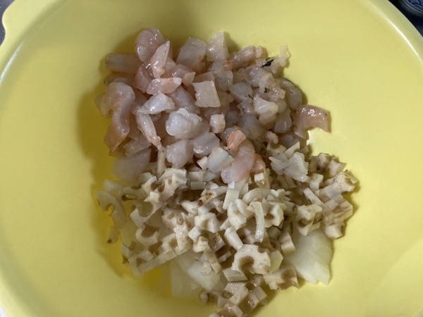 材料は、むき海老、ハンペン、玉ねぎ、片栗粉、メリケン粉、卵、パン粉、マヨネーズ、塩胡椒 (+蓮根)