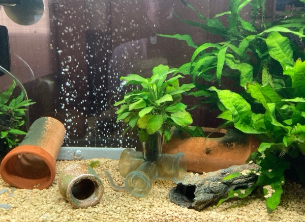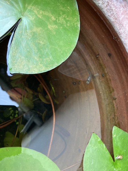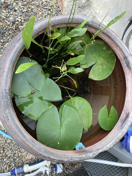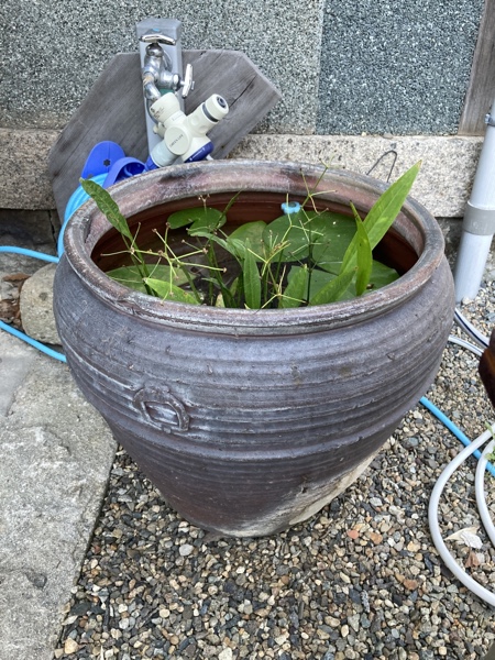 大きな水槽にこの二匹だけでは、あまりにも寂しいので、4月頃でしたか境内にある古い甕に最後の二匹を移してやりました。その甕の中には水草、タニシ、苔、微生物🦠などが自生していて、より自然に近い環境で最期をお過ごしくださいというおもいからでした。