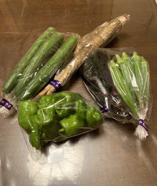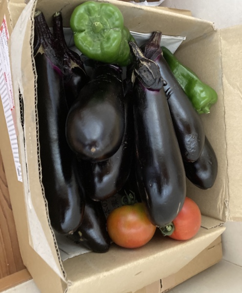 さりげなく玄関さきに👇総代様😅 いかにも美味しそうな綺麗な茄子に、ピーマン、トマト…ありがたいです😆