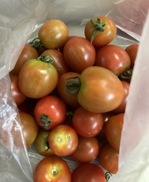 👆お持たせいただきましたお野菜、中村さん😊👇トマト、玉葱、プロの領域は、尾嶋さん😆ヘチマのようなズキーニ、石田さん😆
