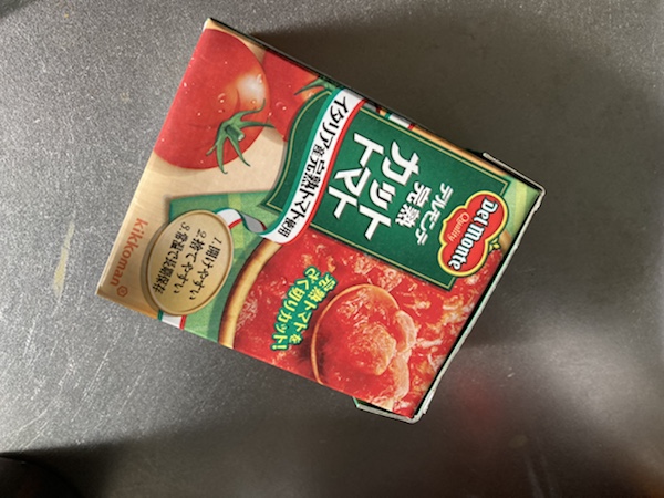 ここに、固形ブイヨン一個、カットトマト一箱(ひと缶)と水約450ccをいれます👇