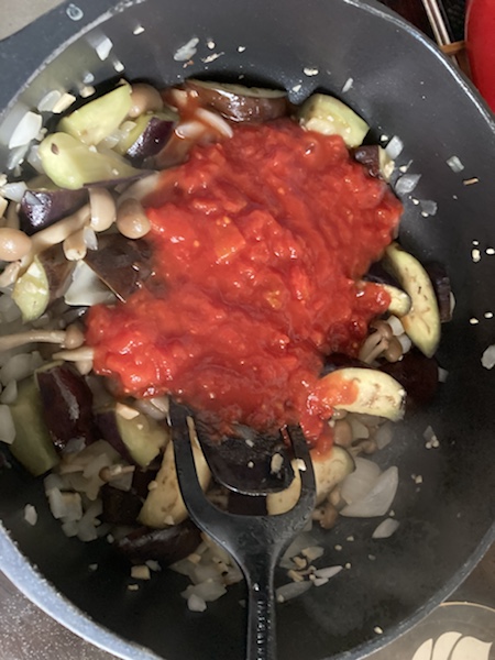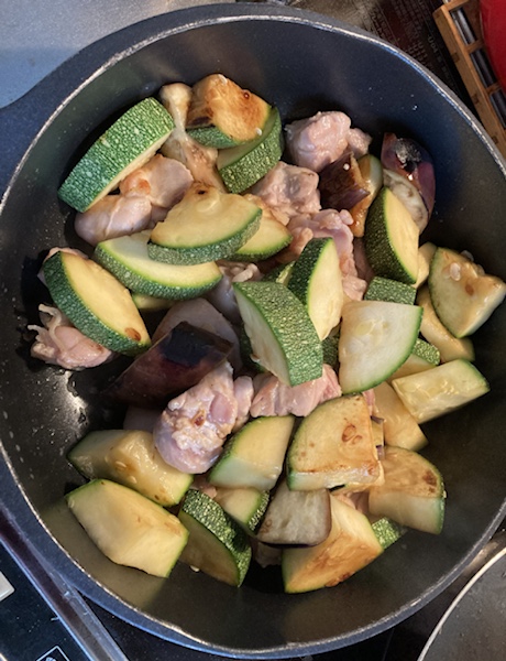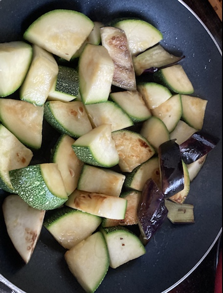 フライパンにオリーブ油、ズッキーニ、玉ねぎ、那須に少し焼き色がつくまで炒めます👇