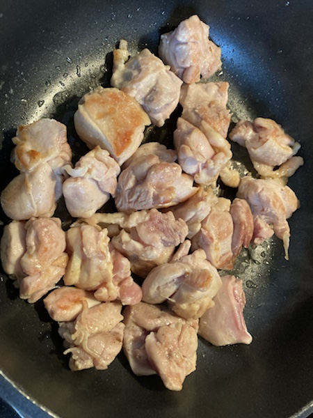 野菜だけだと、淡白なので、鶏肉のモモ肉を一口サイズにして炒めます。👇