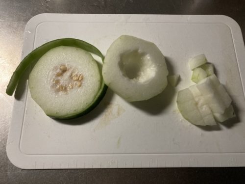 本日は、太田の中村総代さまよりいただきました、緑緑した冬瓜で、お吸い物を作ってみようとおもいます。いつも自家製のお野菜ありがとうございます。