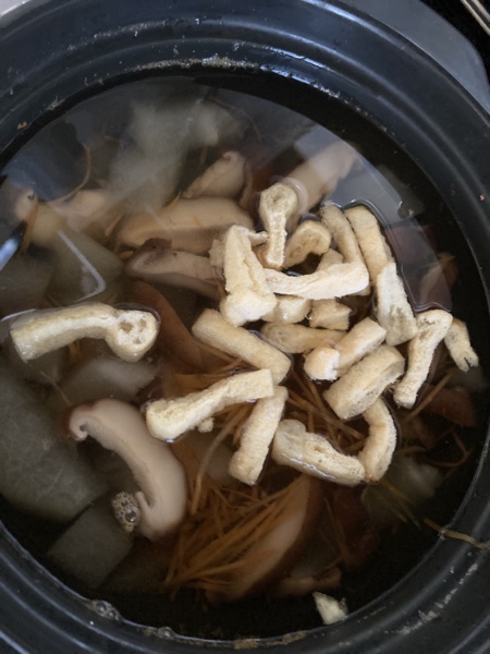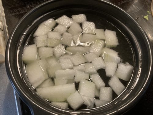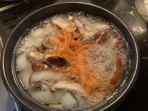 鍋に水を入れ、その中に冬瓜、椎茸、人参のスライスを。