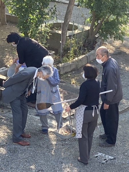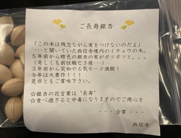 その前に、お寺の銀杏(いちょう)からトレトレの銀杏(ぎんなん)のふるまいです。西信寺と書いてありますが、婦人会会長の平岩育子さんのお振る舞いでございます。ありがとうございます😭