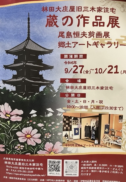 9月27日(金)〜10月21日(月)まで、尾島恒夫巨匠によります剪画展が、姫路市林田町の旧三木家(林田の大庄屋)旧家において開催されます。お問い合わせ先は、090-8234-0480 まで。