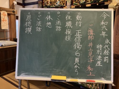 今日明日と、永代経法要をお勤めいたします。ご講師は昨年と同じく、井上見淳司教です。
