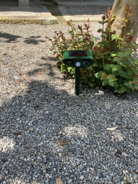 そこで通販サイトで、何かしらいいものないかなぁ〜と検索🔍してましたら、ありました! 猫たちの嫌う超音波で境内地に寄り付かなくなるという超ハイテクマシーンです。ソーラー電池内蔵ですので、電気代フリー。1台二千六百八十円也 ‼️