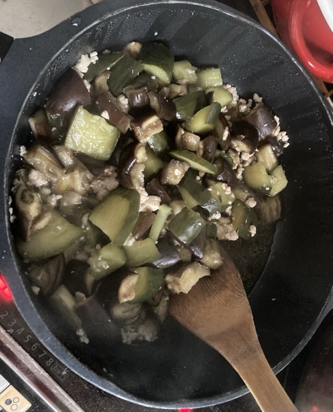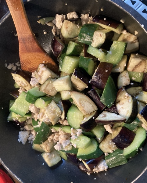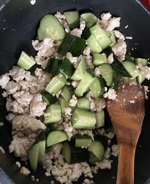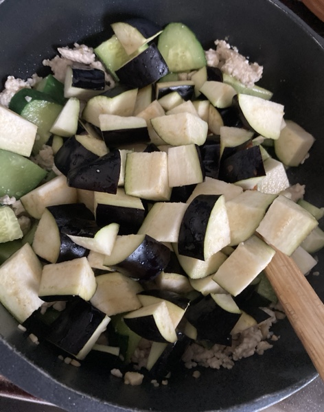 お寺は豚ミンチではなく、鶏肉むねミンチ(約250グラム)で、あっさり麻婆茄子をつくります。👇焼き色をつけたら、ジャイアント胡瓜のブツぎりを入れて、混ぜ混ぜ
